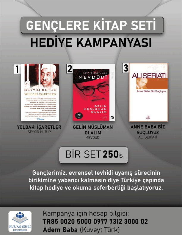 Seyyid Kutub'un "Yoldaki İşaretler", Mevdudi'nin "Gelin Mülüman Olalım" ve Ali Şeriati'nin "Anna Baba Biz Suçluyuz" kitapalrı set halinde gençlere hediye edilip okuma halkaları oluşturulacak.