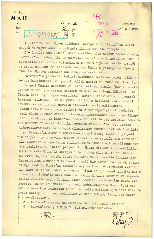 Bu belge, “Arabistanlı Lawrence” olarak bilinen ünlü İngiliz ajanı Thomas Edward Lawrence’ın, Mısır, Suriye ve Irak’ta kıyafet değiştirerek ve farklı isimler altında yürüttüğü faaliyetlere ilişkin olarak Milli Emniyet Hizmeti Riyaseti tarafından hazırlanan 23 Eylül 1929 tarihli yazı oldu.